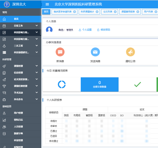 2、核心业务管理系统(科研项目、经费、成果、学术活动管理等,其中成果包含论文、著作、鉴定、专利、软件著作权、标准等)